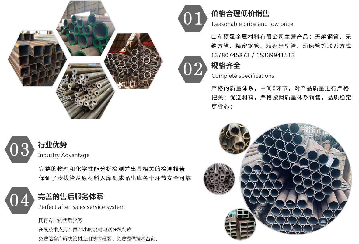 山東碩晟金屬材料有限公司主要銷售:無縫鋼管、無縫方管、精密鋼管、精密異型管、珩磨管等產品等產品,地理位置交通十分方便, 倉儲場地,裝車免費實行機械化裝卸配載運輸一條龍服務。 本公司鋼管現貨規格齊全,貨源充足,多種管材規格。特種材質無縫鋼管,交貨及時,價格低,質量好,并附原始材質書或復印件,節假日照常營業、并可代辦汽運、火運,量大可以在鋼廠直接發貨。節假日照常發貨,并為用戶代辦運輸,調劑余缺,歡迎廣大客戶朋友光臨惠顧! 主營材質:10#、20#、35#、45#、Q345(ABCD)16Mn、20G、Q235、ABCD 20A、27SiMn、40MnB、20MnVB、20Cr…